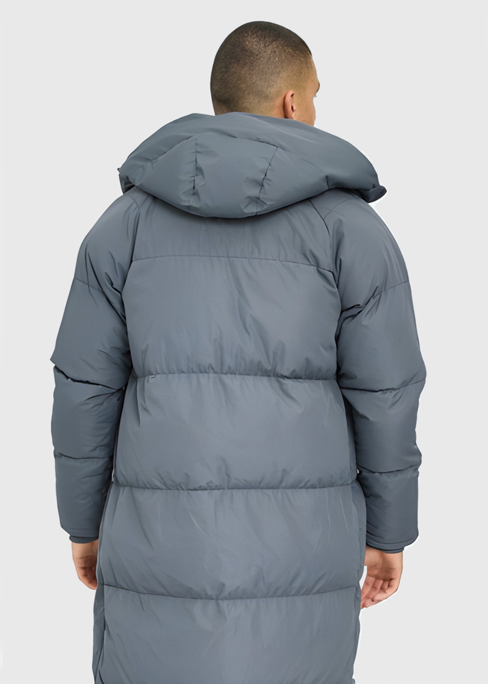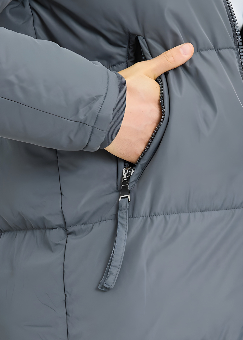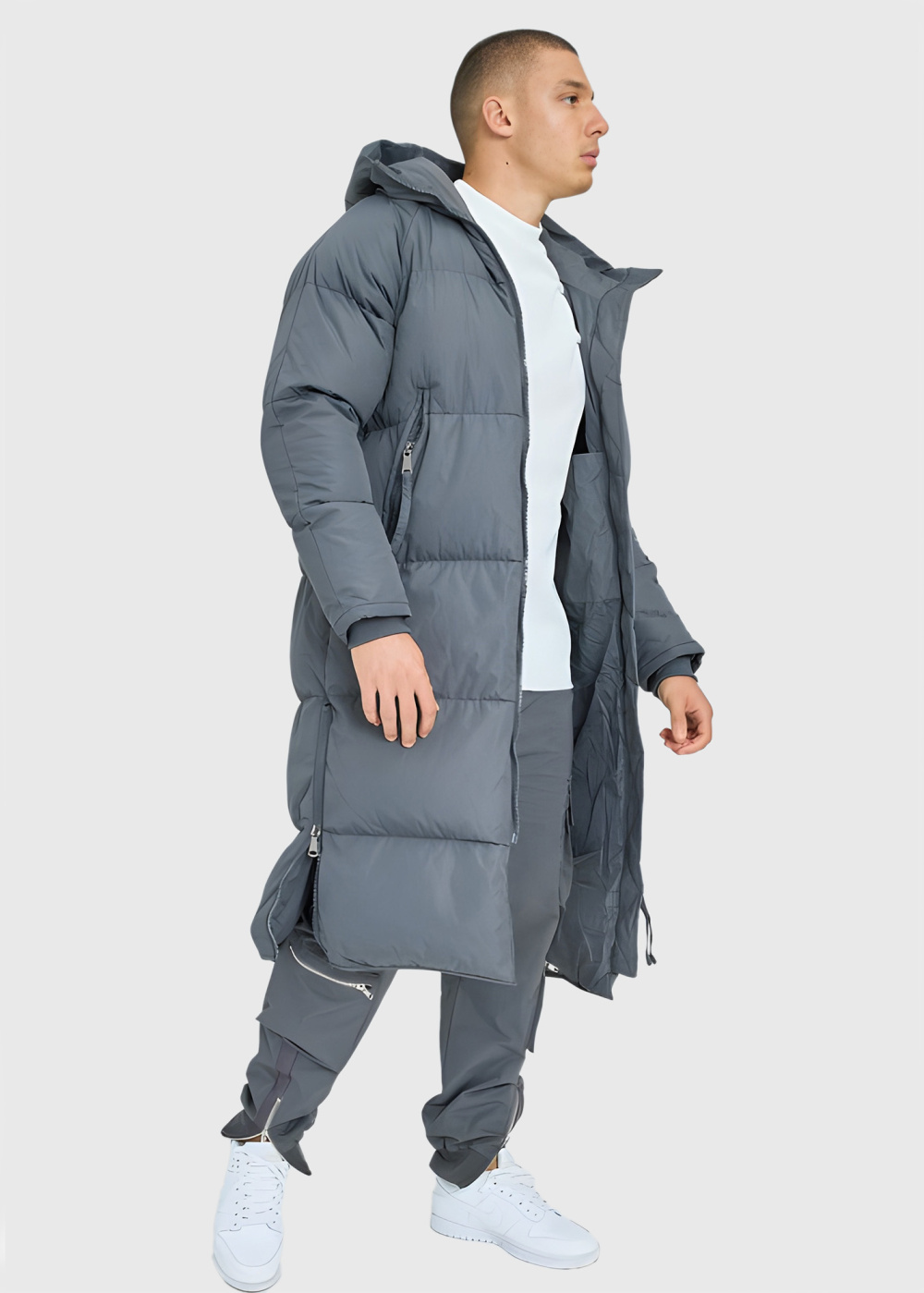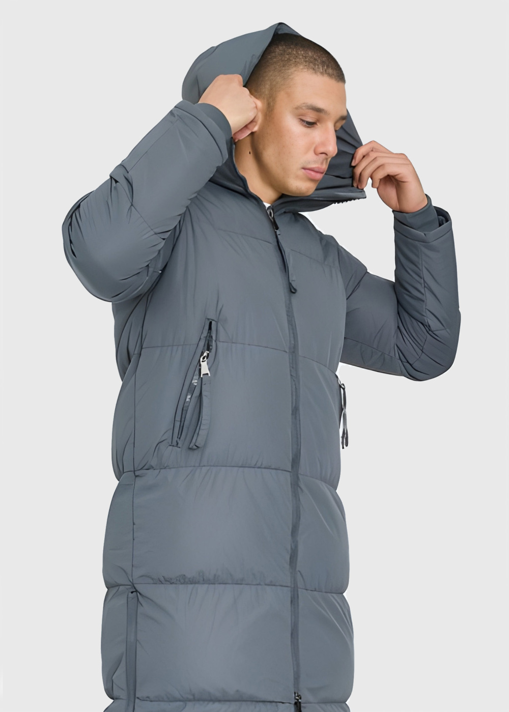 Серая длинная куртка с капюшоном