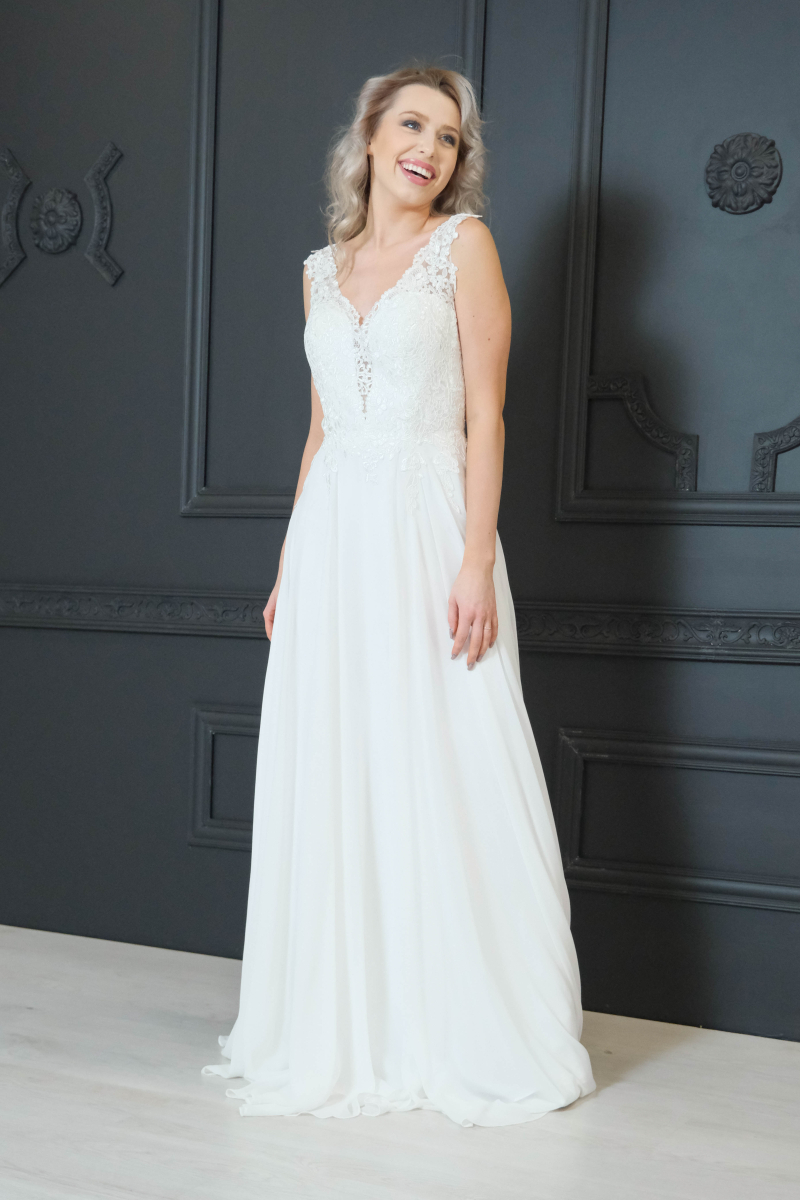 Maiga kāzu kleita ar izšūtu mežģīņu augšdaļu un krītošu A-silurta svārku daļu.