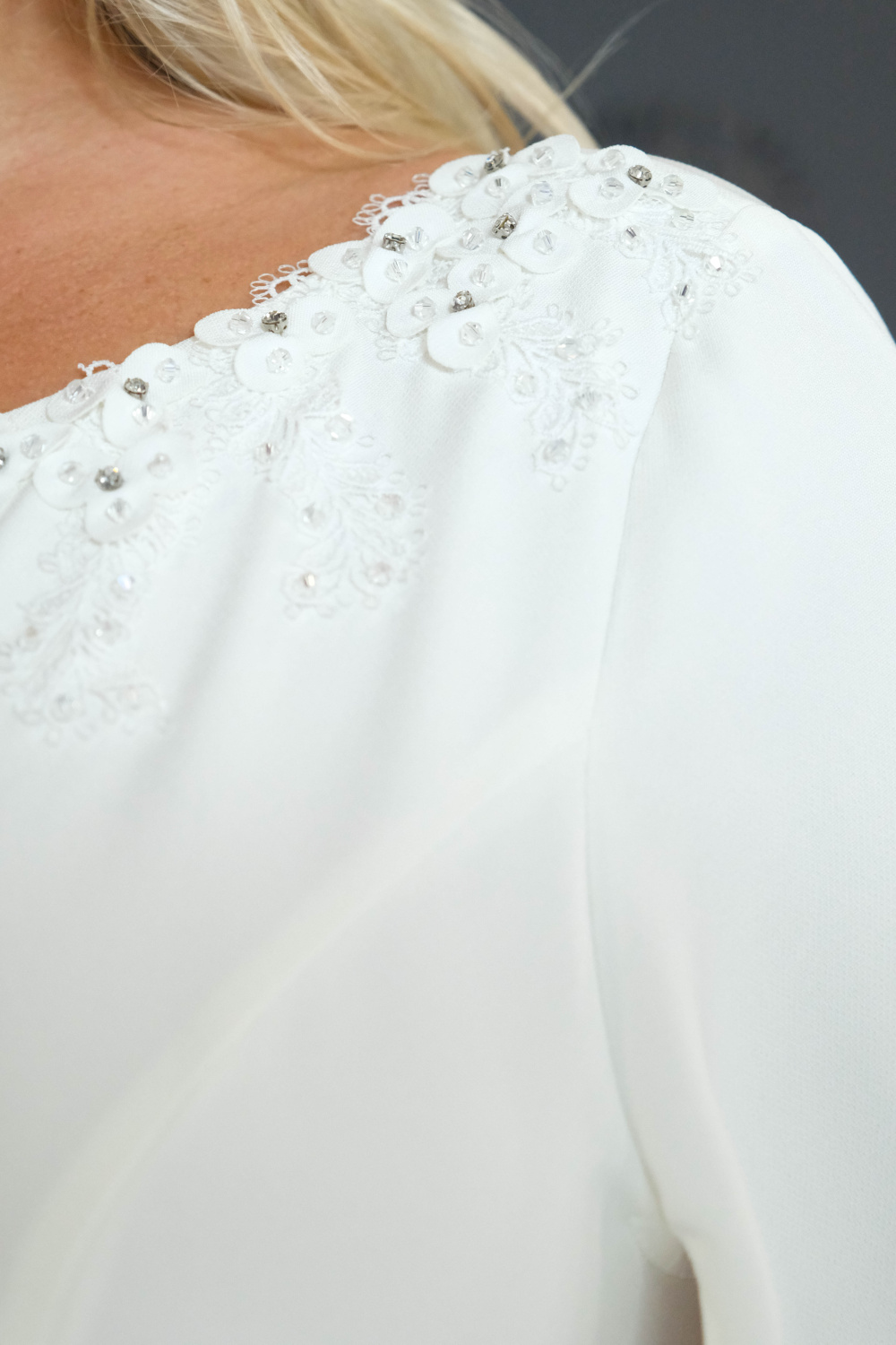 platām piedurknēm un nelielu ziedu dekoru.