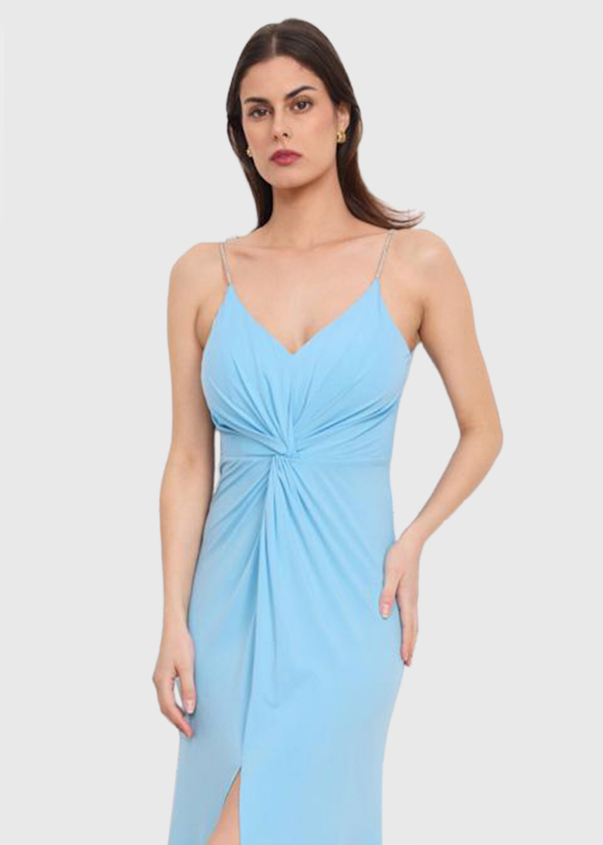 Gultena gaiši zila vakarkleita ar šķēlumu